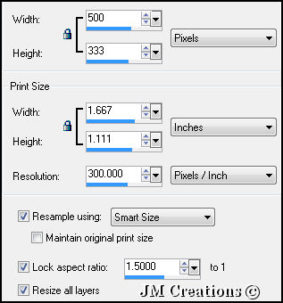 Please set the width at 500 pixels, Resample Using Smart Size, Lock Aspect Ratio and Resize all layers are checked...